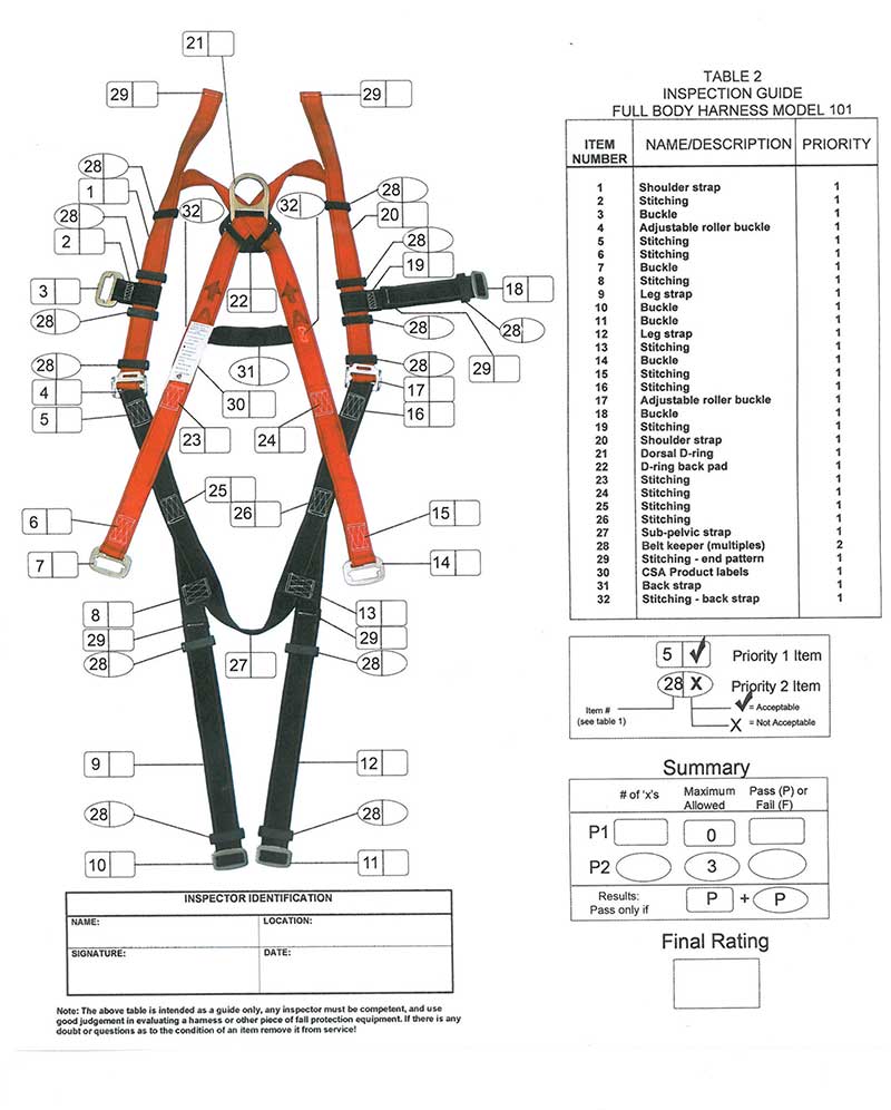 Fall Protection Inspection NameRick DoerksenEvan HerronTrey EvensonJosh AndreDylan BairdAdam BuhlerDateLocationInspection1. Shoulder StrapGoodBad2. StitchingGoodBad3. BuckleGoodBad4. Adjustable roller buckleGoodBad5. StitchingGoodBad6. StitchingGoodBad7. BuckleGoodBad8. StitchingGoodBad9. Leg StrapGoodBad10. BuckleGoodBad11. BuckleGoodBad12. Leg StrapGoodBad13. StitchingGoodBad14. BuckleGoodBad15. StitchingGoodBad16. StitchingGoodBad17. Adjustable Roller BuckleGoodBad18. BuckleGoodBad19. StitchingGoodBad20. Shoulder StrapGoodBad21. Dorsal D-ringGoodBad22. D-ring back padGoodBad23. StitchingGoodBad24. StitchingGoodBad25. StitchingGoodBad26. StitchingGoodBad27. Sub-pelvic StrapGoodBad28. Belt Keeper (multiples)GoodBad29. Stitching - End PatternGoodBad30. CSA Product LabelsGoodBad31. Back StrapGoodBad32. Stirching - back strapGoodBadSummaryP1 - # of x'sPass (P) or Fail (F)P2 - # of x'sPass (P) or Fail (F)Final RatingSubmit